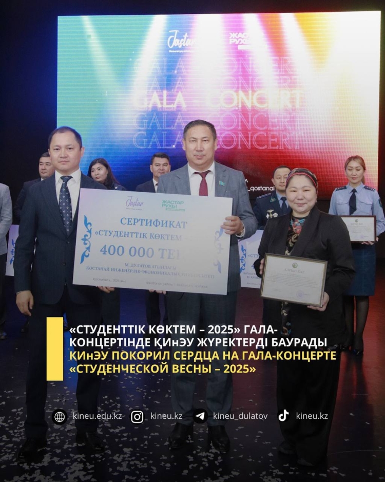 «Студенттік көктем – 2025» фестивалінің екінші күні шеңберінде сахнада нағыз жұлдыздар шеруін тамашаладық – бүгін гала-концерт пен қатысушыларды марапаттау рәсімі өтті. Өңіріміздің жоғары оқу орындары өздерінің ең үздік шығармашылық нөмірлерін ұсынды. Әрбір қойылым – шабыт пен жастық қуатқа толы жарқын өнер туындысына айналғандай. Фестиваль қатысушыларына жылы лебізін білдірген Қостанай облысы әкімінің орынбасары Бақытжан Хаберұлы Нарымбетов, өңіріміздің басты байлығы – білімді де талантты жастар екенін ерекше атап өтті. Кештің ең әсерлі сәттерінің бірі – М. Дулатов атындағы Қостанай инженерлік-экономикалық университетінің «Жить» әніне қойылған қойылымы болды. Бұл сахналық көрініс көрерменнің жүрегін елжіретті. Студенттермен бірге сахнаға профессор Жеңіс-Нұры Мұрзатайұлы Кужекеев, цифрландыру және ақпараттық технологиялар бөлімінің басшысы Алишер Амантайұлы Амантаев, бас есепші Марина Георгиевна Лисогор, ғылыми хатшы Наталья Алексеевна Камышева, спорт-сауықтыру кешенінің директоры Татьяна Александровна Чернышова және мұрағат меңгерушісі Бақыт Қайырбекқызы Қасенова шықты. Залда тыныштық орнады — әр көрермен сахнадағы хикаяны өз жүрегінен өткізді. Қойылым соңында бүкіл зал тік тұрып қол соқты. Көпшіліктің көзі жасқа толды. Бұл — жүрекке жеткен өнердің, шынайылық пен бірліктің жеңісі еді. Гала-концерт барысында үздік деп танылған спортшылар, пікірсайысшылар мен зияткерлік квест қатысушылары марапатталды. Университетіміздің волейболшысы Маржан Жұмағалиева турнирдің ең үздік ойыншысы атанды. Фестивальдің шарықтау шегі — марапаттау рәсімі. Қостанай инженерлік-экономикалық университеті фестивальге белсенді қатысып, жастар шығармашылығын дамытуға қосқан үлесі үшін алғыс хатпен және 400 000 теңге көлеміндегі ақшалай сертификатпен марапатталды. Студенттік көктем — бұл жай ғана фестиваль емес, бұл – жастар рухының мерекесі.