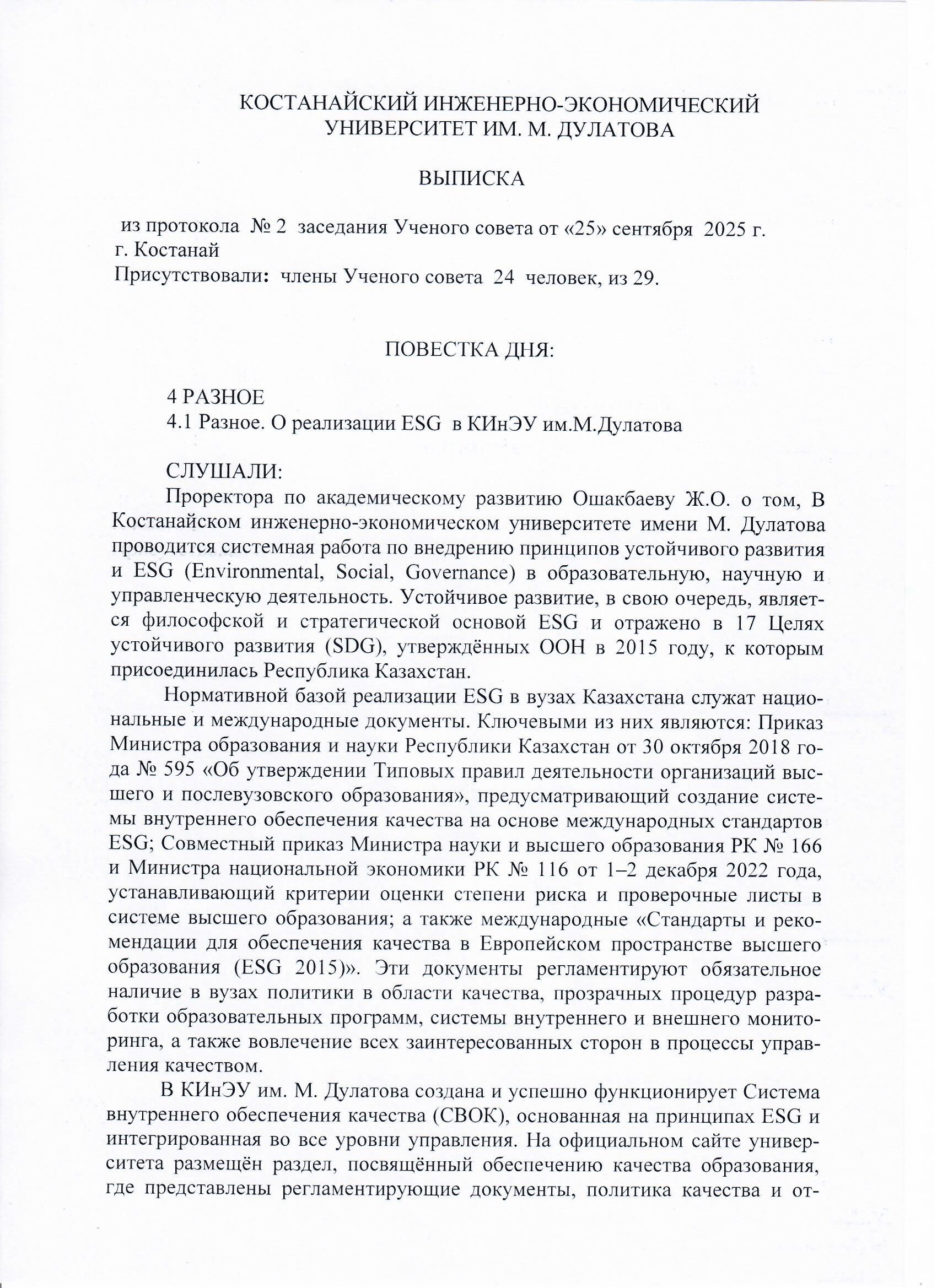 4.1 Разное. О реализации ESG в КИнЭУ им М Дулатова
