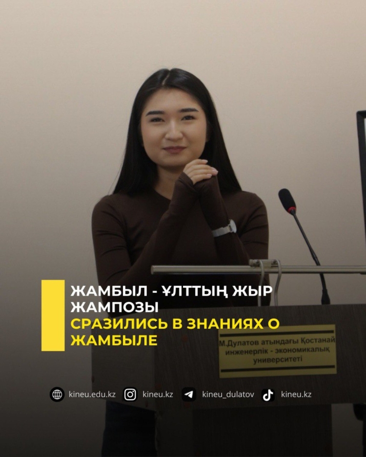 Департамент молодежной политики Костанайского инженерно-экономического университета провел интеллектуальную игру, посвященную 180-летию великого поэта казахской степи Жамбыла Жабаева. В интеллектуальной борьбе сошлись три команды. Участникам предстояло выбрать одну из пяти ячеек с баллами от 100 до 500 и ответить на вопросы, посвященные жизни и творчеству поэта. Студенты вспоминали интересные факты биографии Жамбыла, его путь в искусстве айтыса, произведения, а также значение его творчества для казахской литературы и культуры. Игра прошла в атмосфере азарта и живого интереса. Участники продемонстрировали высокий уровень эрудиции, знания и уважение к наследию великого поэта.